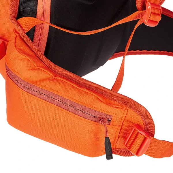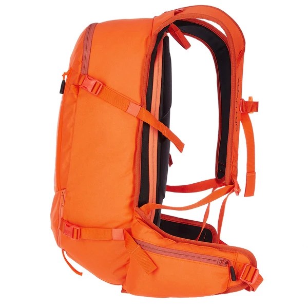 Der sportliche Rucksack bringt 850 g auf die Waage und schafft so ein sehr gutes Verhältnis zwischen geringem Gewicht, der nötigen Strapazierfähigkeit im Winter und umfangreicher Wintersportausstattung. Helmhalterung und Snowboardfixierungen können ggf. abgenommen werden, wodurch noch einmal 30 g gespart werden. Der Rucksack ist aus robustem 630D Polyester mit einer wasserabweisenden PU-Beschichtung gemacht. Das Tragesystem besteht aus isolierendem, thermogeformeten EVA-Schaumstoff und sitzt optimal am Rücken.